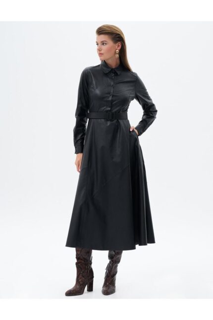 Dikiş Detaylı Suni Deri Elbise Siyah
