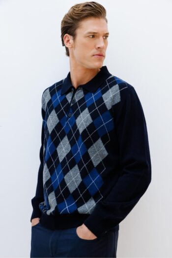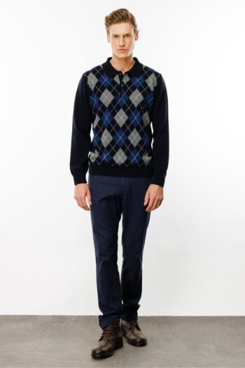 Erkek Polo Yaka Önü Baklava Desenli Yün Kazak K.Lacivert