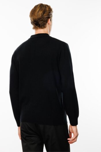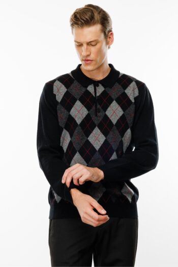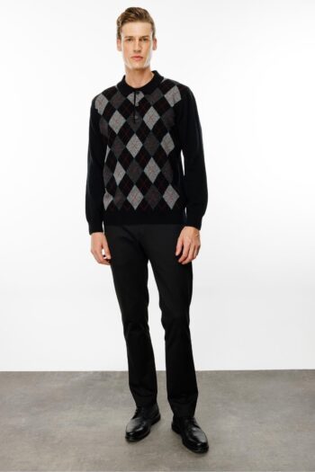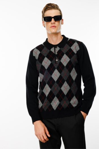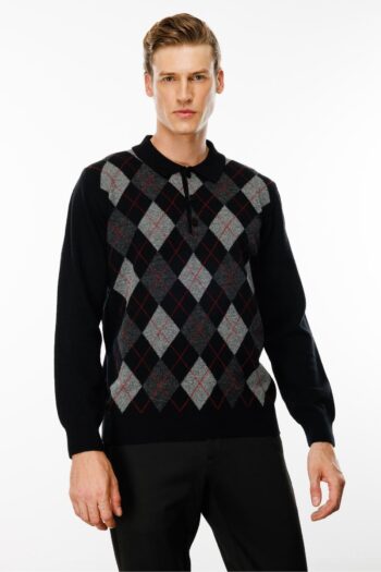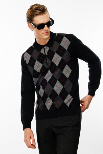 Erkek Polo Yaka Önü Baklava Desenli Yün Kazak Siyah