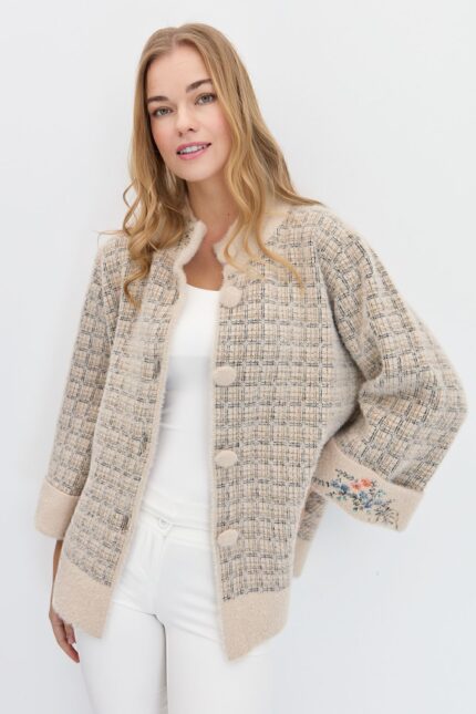 Günlük kullanıma uygun tasarımıyla her ortamda rahatlıkla tercih edilebilen bir ceket; Triko görünümlü dokuma tipi, şık ve modern bir görünüm sunar; Yünlü materyali sayesinde sıcak tutan ve konforlu bir kullanım sağlar; Desenli yapısıyla göz alıcı bir stil oluştururken, renkli çiçek detayları ile feminen bir dokunuş katılır; Orta kalınlıkta kumaşı, mevsim geçişlerinde ideal bir tercih oluşturur; Truvakar kol tasarımı ile hareket özgürlüğü sunarken, şıklığından ödün vermez; Triko kumaş tipi, yumuşak dokusuyla gün boyu konforlu bir deneyim sağlar; Dik yaka detayı ile zarif bir boyun hattı sunarken, tüm yaş gruplarına hitap eden geniş beden skalasıyla herkes için uygundur; Standart boy uzunluğuyla farklı vücut tiplerine uyum sağlayarak rahat bir kullanım imkanı tanır; Büyük beden kalıbı sayesinde geniş beden aralığına sahip;