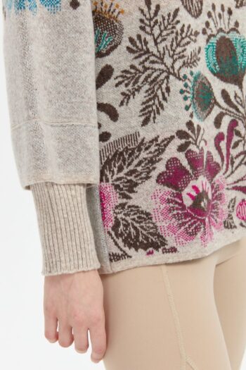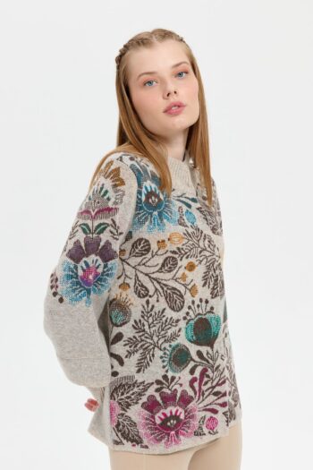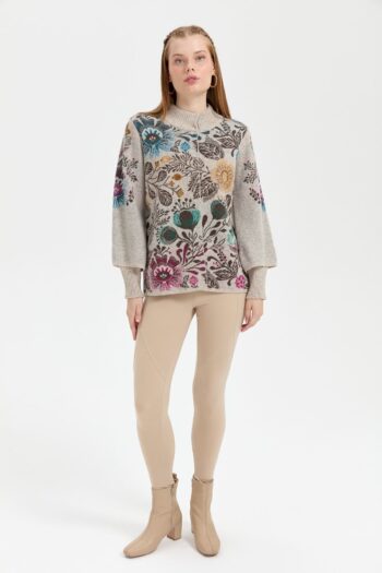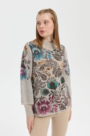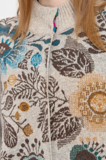 Kadın Dik Yaka Önü Renkli Çiçekli Kısa Yün Ceket V.Bej