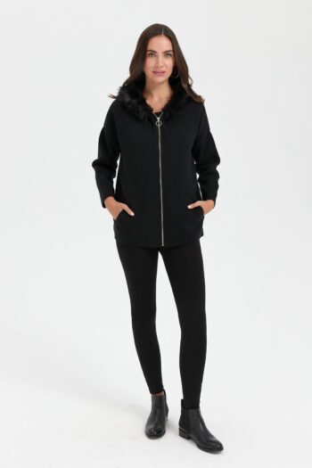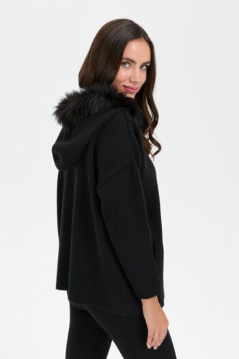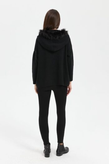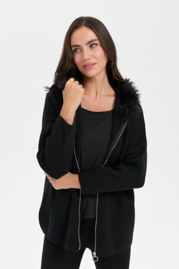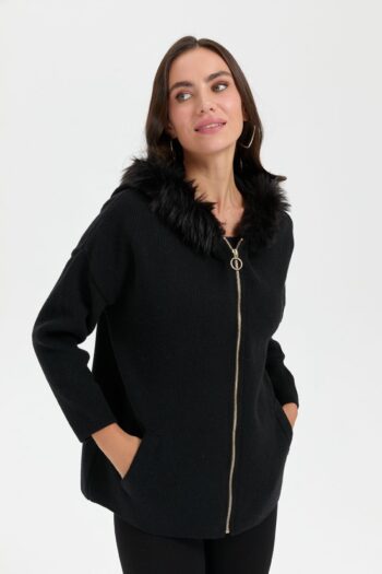 Kadın Kapüşonu Kürklü Fermuarlı Yün Hırka Siyah