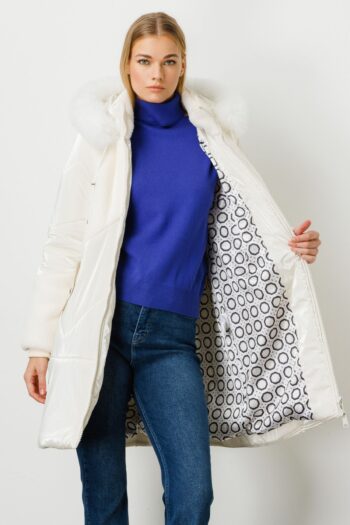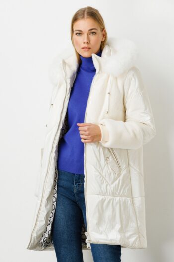 Kadın Parlak Kumaş Kürk Kapüşonlu Kaban