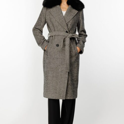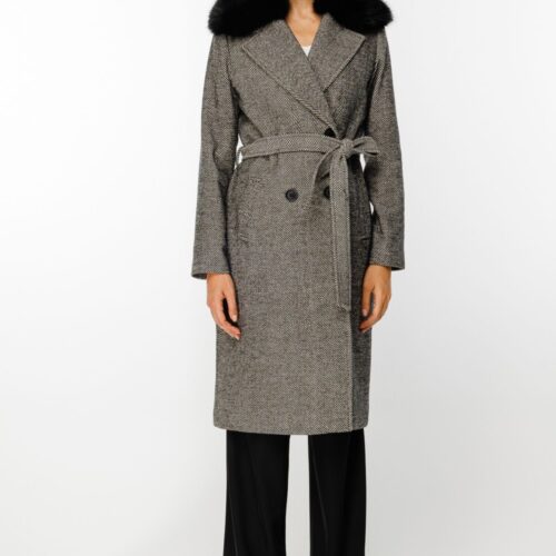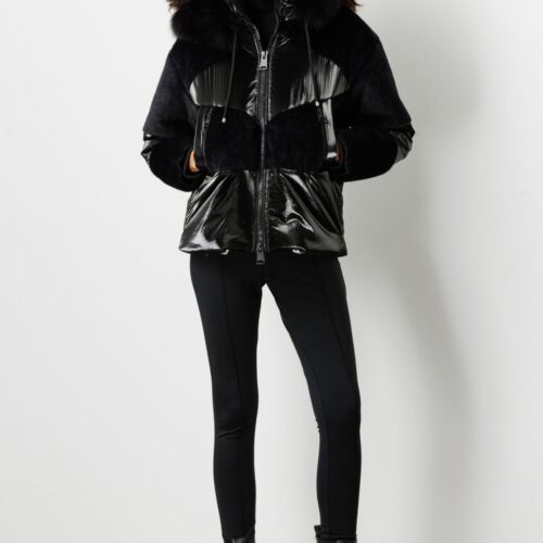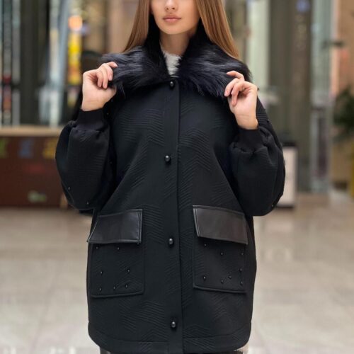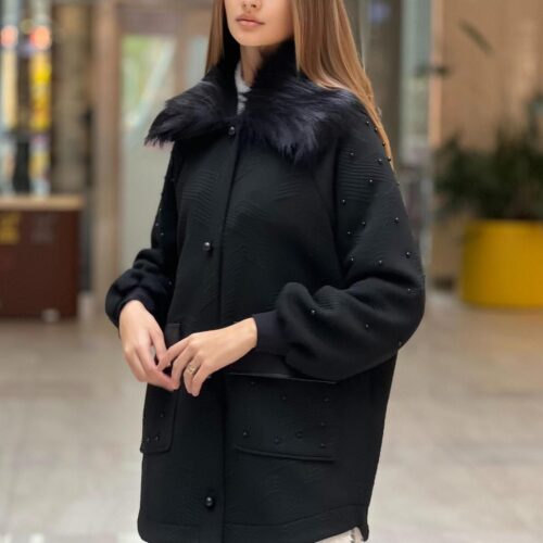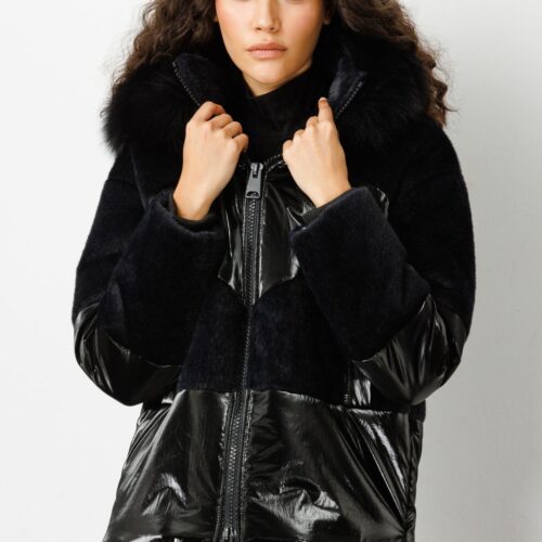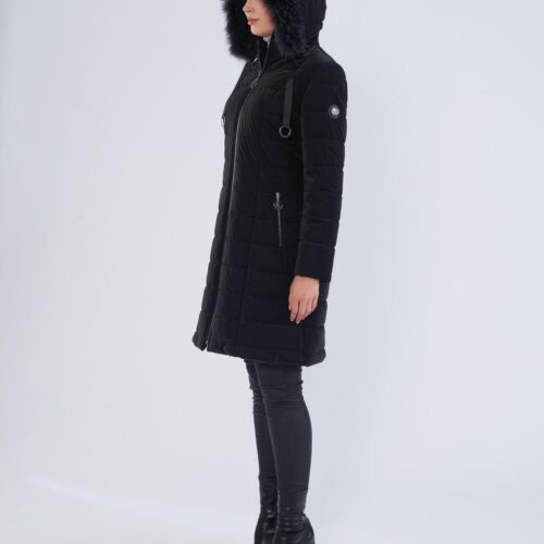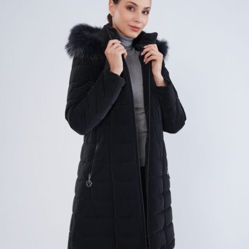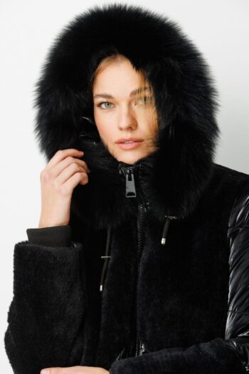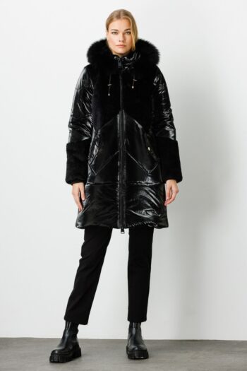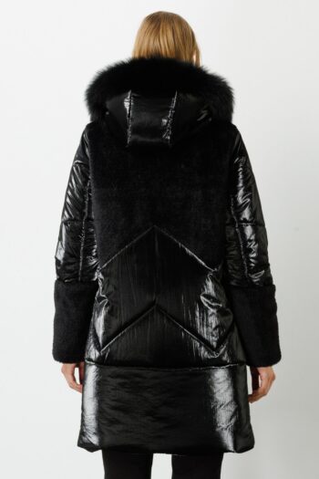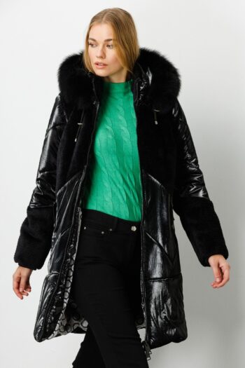 Kadın Parlak Kumaş Kürk Kapüşonlu Kaban 7555 Siyah