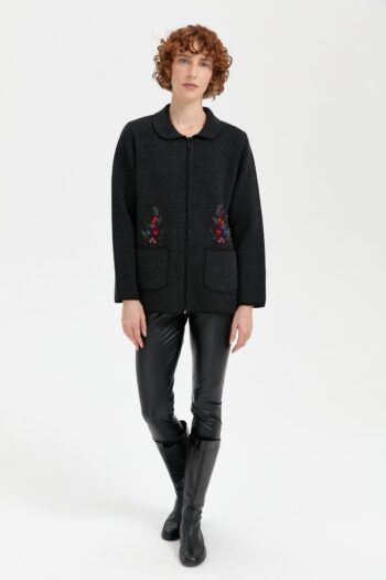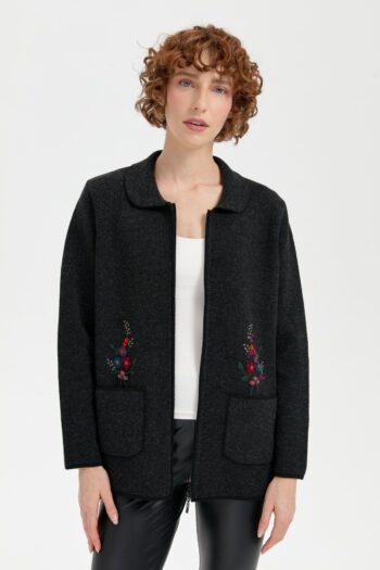 Kadın Polo Yaka İşlemeli Kısa Yün Hırka Siyah