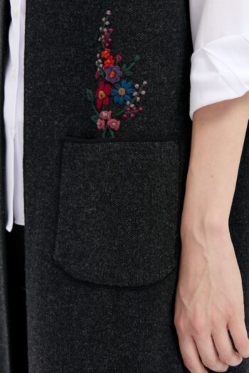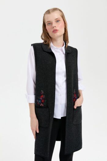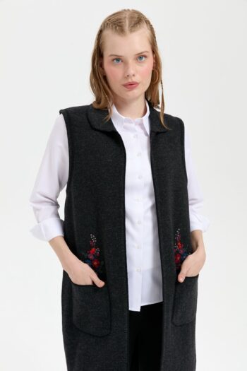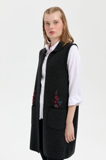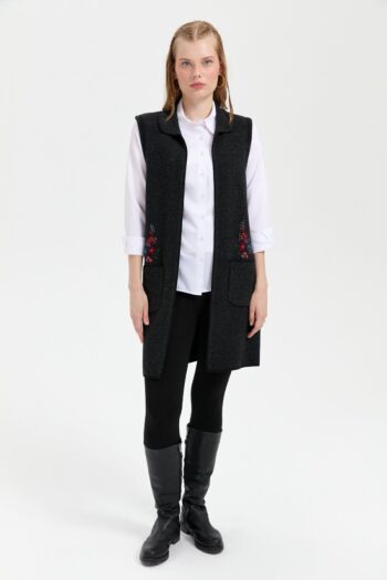 Kadın Polo Yaka Önü Açık İşlemeli Uzun Yün Yelek Siyah