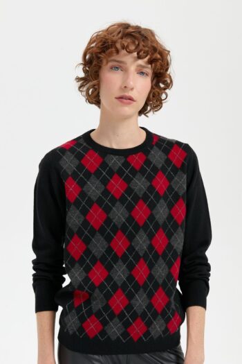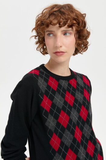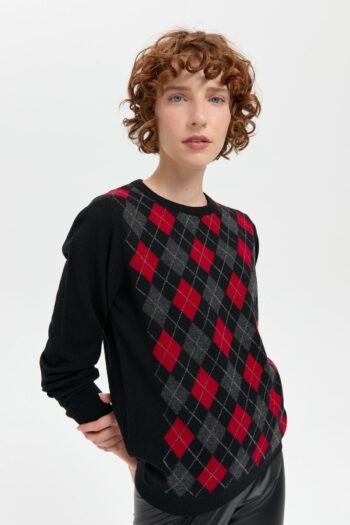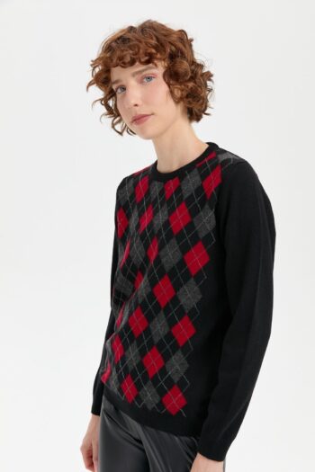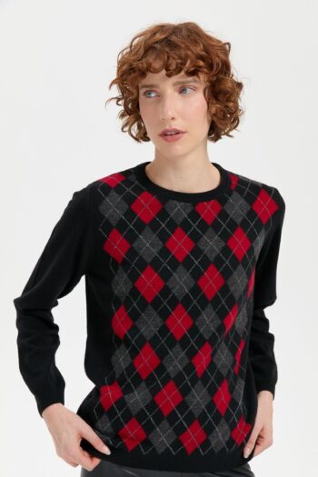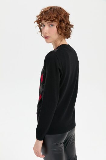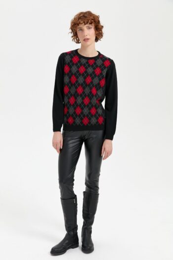 Kadın Sıfır Yaka Önü Baklava Desenli Yün Kazak Siyah