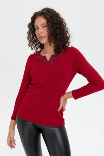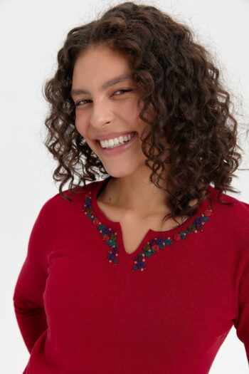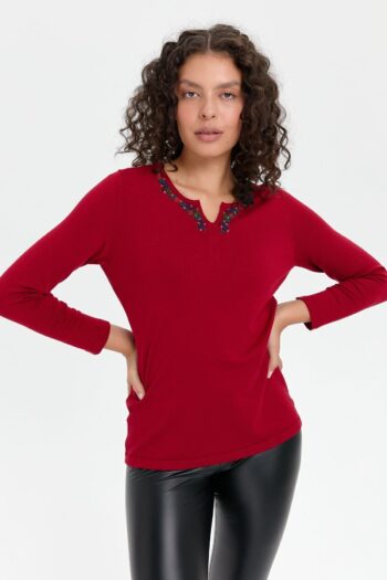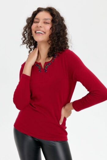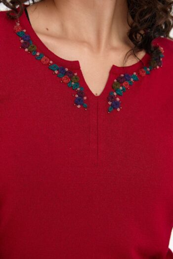 Kadın Yakası Renkli Çiçek İşlemeli Bluz K.Kırmızı