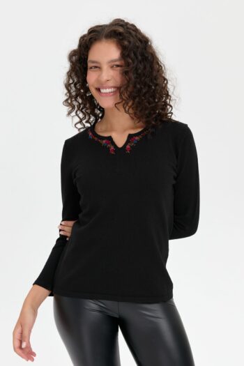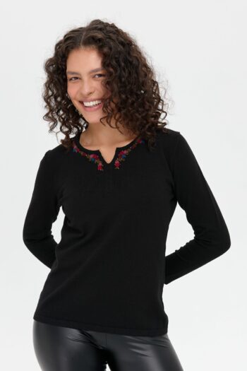 Kadın Yakası Renkli Çiçek İşlemeli Bluz Siyah