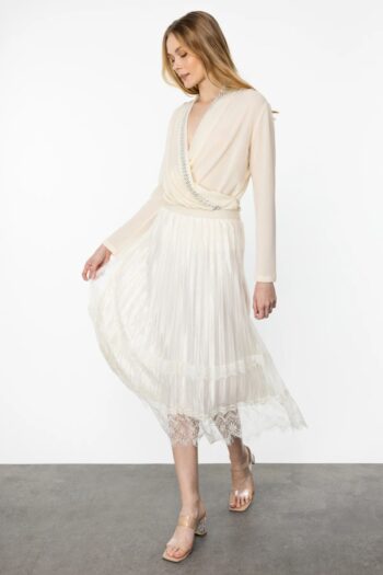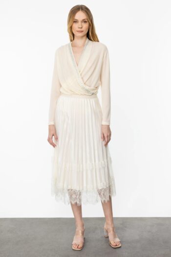 Astarlı yapısı ile rahatlık ve şıklığı bir arada sunar, gün boyu konforlu bir kullanım sağlar; Standart boyu sayesinde farklı vücut tiplerine uyum sağlar ve klasik bir görünüm kazandırır; Düz kesimiyle sade ve zarif bir siluet oluşturur, her türlü üst giyimle kolayca kombinlenebilir; Tüm yaş gruplarına hitap eden tasarımıyla geniş bir kullanıcı yelpazesine sahiptir; Günlük kullanım için idealdir; rahatlığı ve şıklığı bir arada sunarak günlük kombinlerin vazgeçilmezi olur; Dantel dokuma tipi ile feminen detaylar ekleyerek sofistike bir hava katar; %100 polyester materyal bileşeni sayesinde dayanıklılık ve uzun ömürlü kullanım vaat eder; Astarlı yapısı ile ekstra konfor sunarken, dantel kumaşıyla göz alıcı bir görünüm sağlar; Dar kalıbı sayesinde vücut hatlarını nazikçe sararak zarif bir siluet oluşturur;