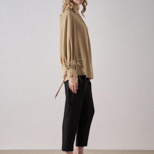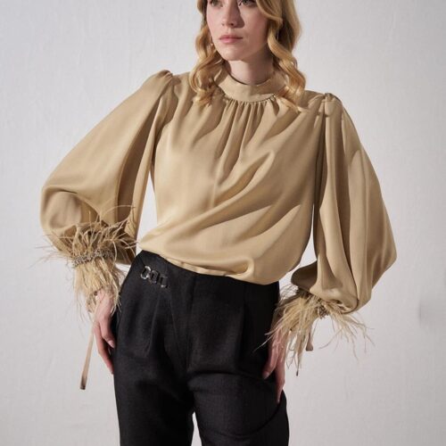 Rahat Kesim Taş Baskılı Uzun Kollu Ekru Kadın Bluz 24EKL01056