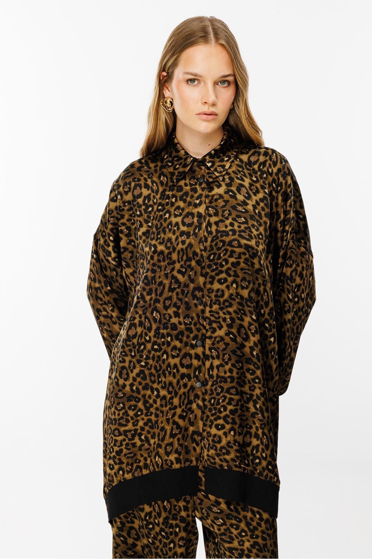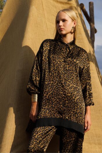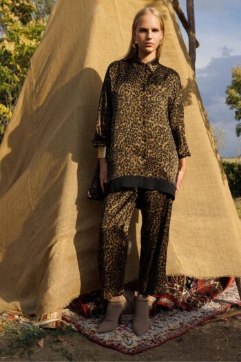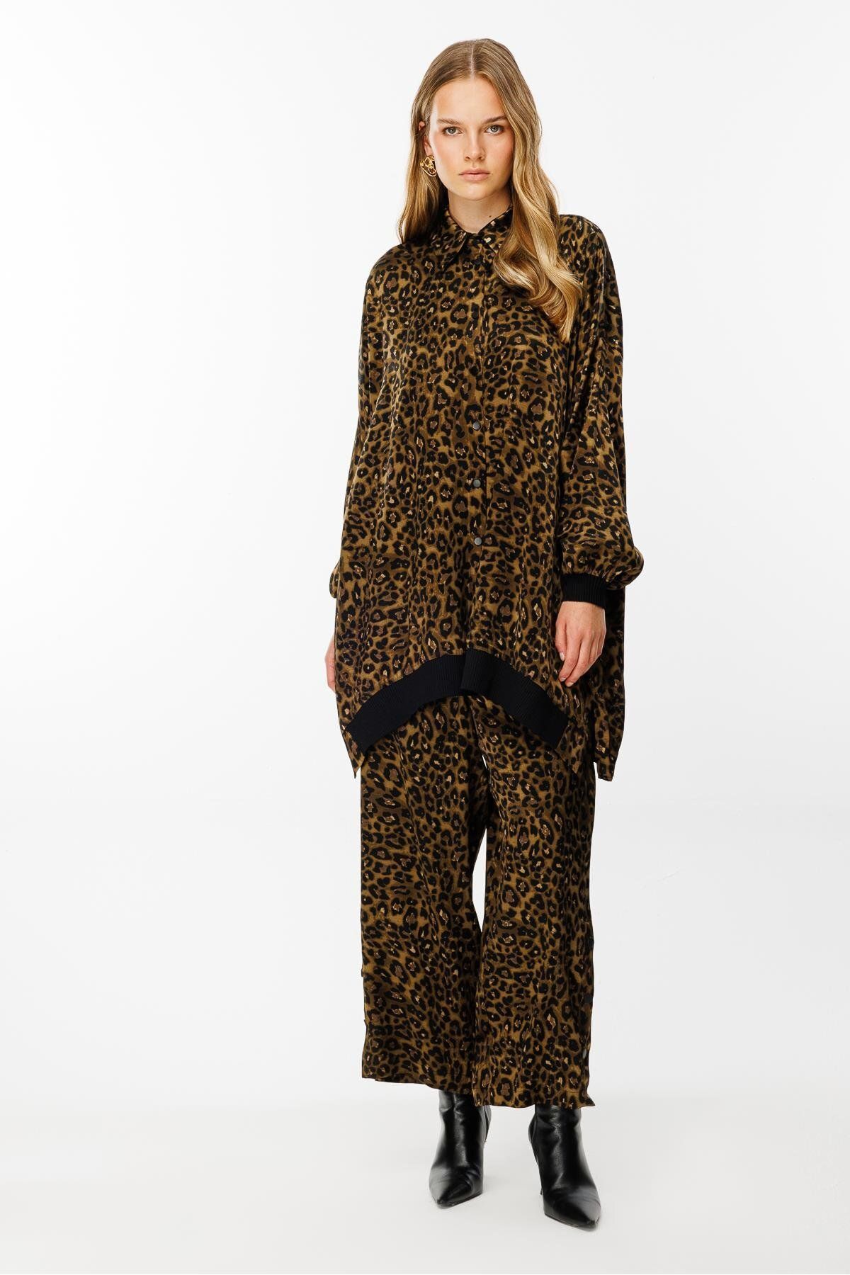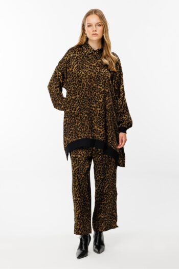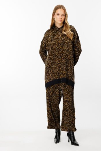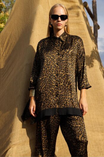 Pantolon arka beli lastikli düğme ve fermuar kapamalı, gömlek yaka düğme kapamalı saten kumaş takım.; –