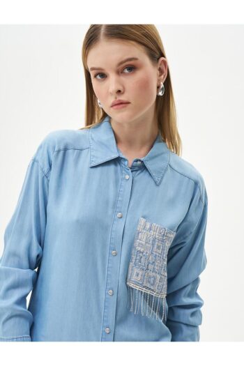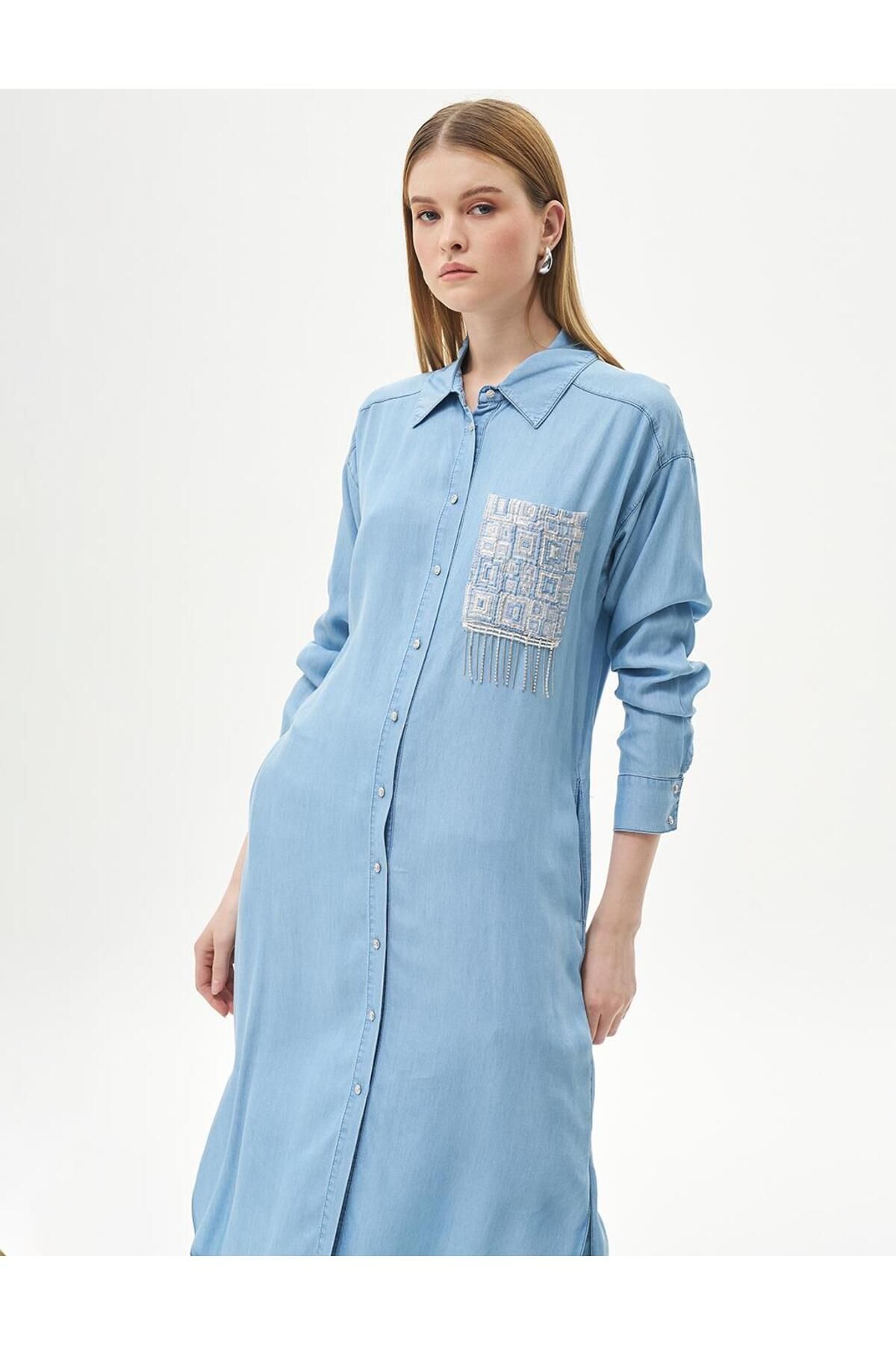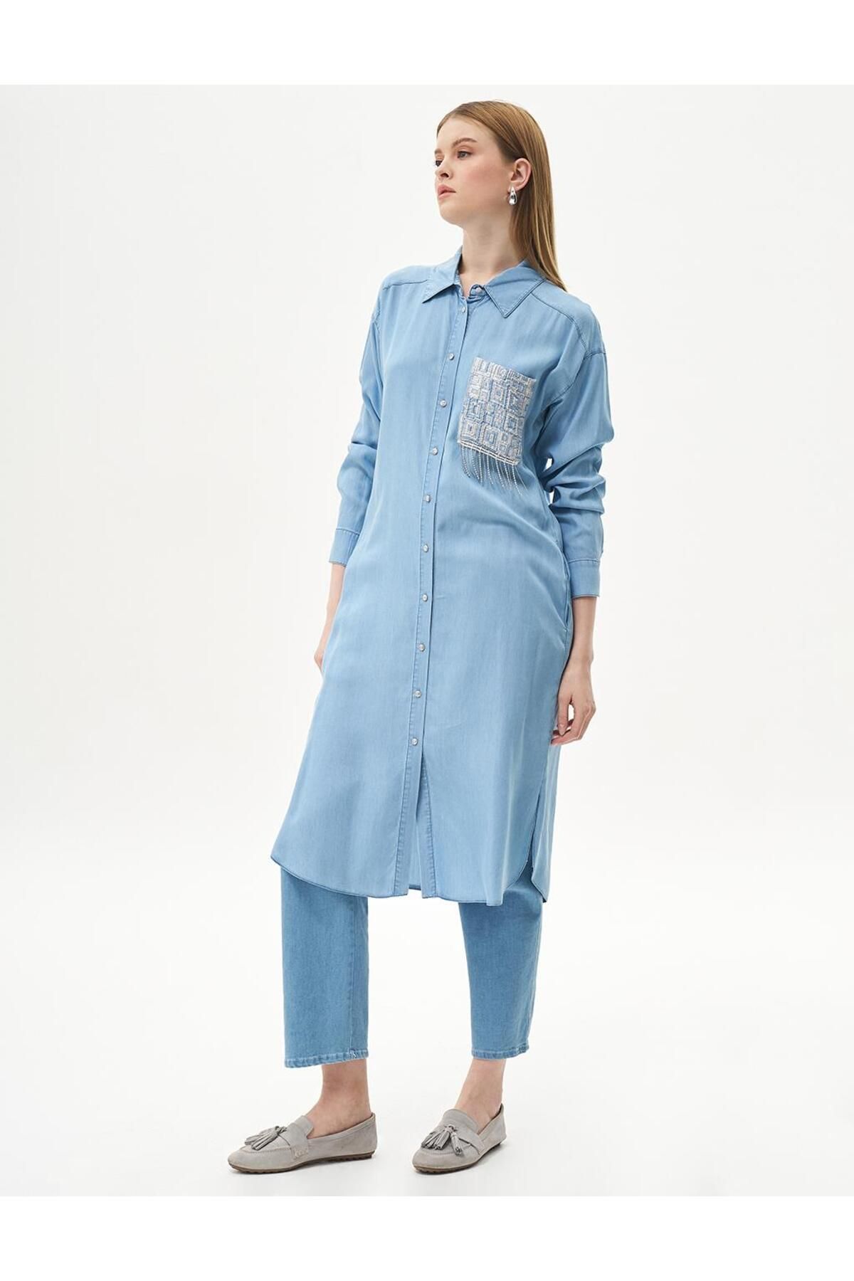 Taşlı Saçak Detaylı Lyocell Tunik Buz Mavisi